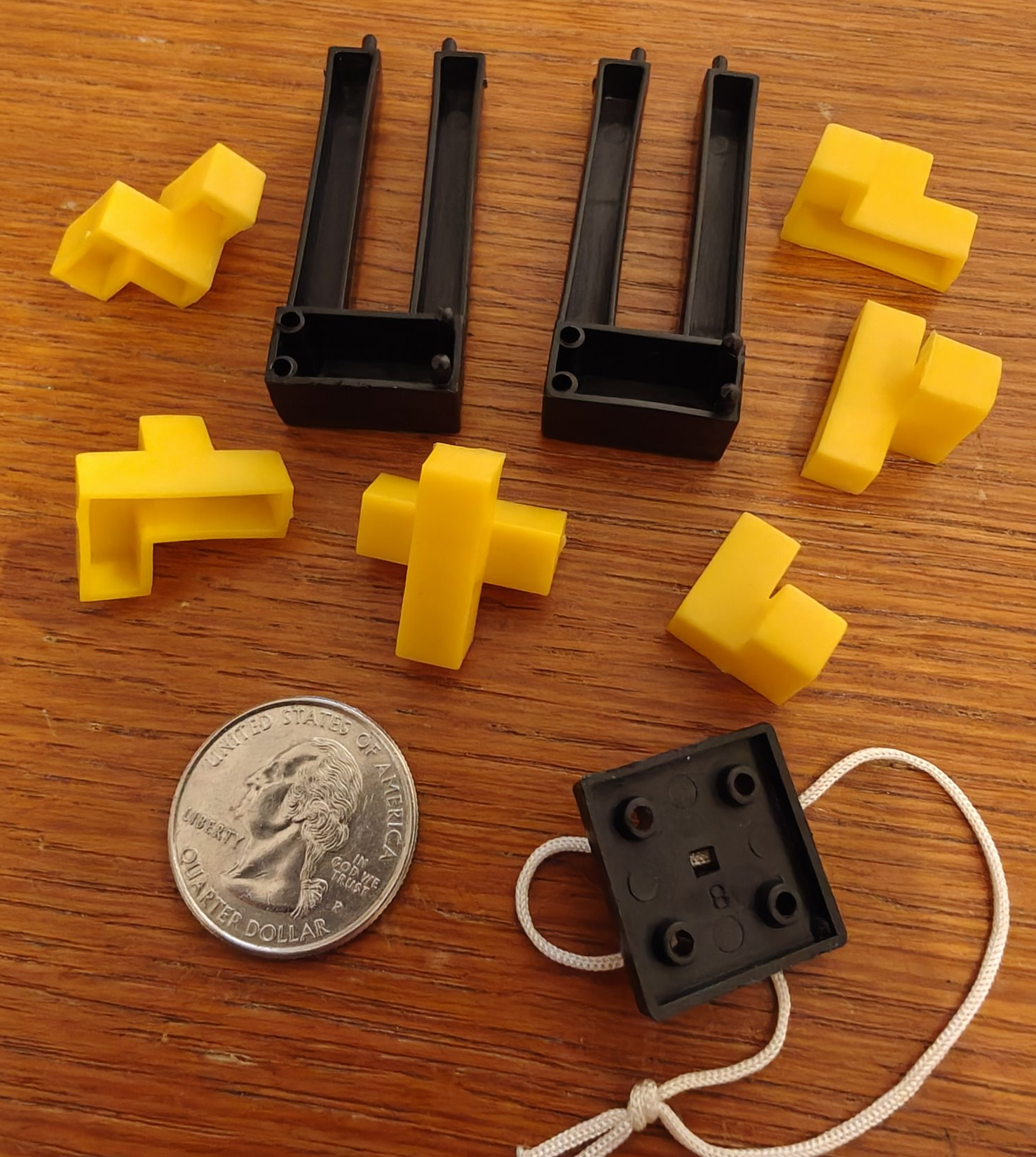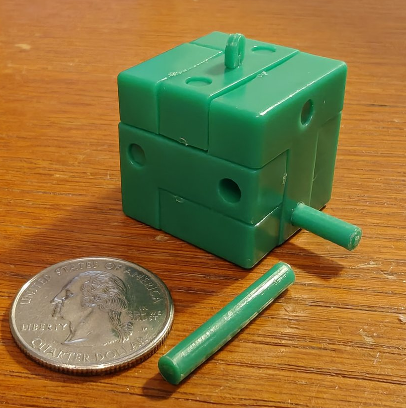 A determined collector should be able to find dozens, if not hundreds, of intact examples of vintage plastic interlocking keychain puzzles, and collecting such puzzles has the advantage of requiring a minimum of storage space! While the typical puzzle has only six pieces, and many of the puzzles share an internal architecture derived from one of a few common recurring designs, some of the interlocking designs can be unexpectedly challenging and pleasingly clever.